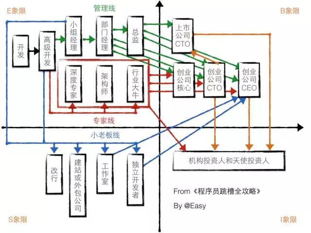 当然路线图是可以调整的,比如应届生----->初级程序员----->小组主管----->初创公司CTO----->B轮公司CTO----->上市公司CTO。但不管怎么调整,自己头脑里边要有清晰的目标。我们总是先在风险最小的路径(比如当前公司)寻求成长不成功时再考虑其他的路径。