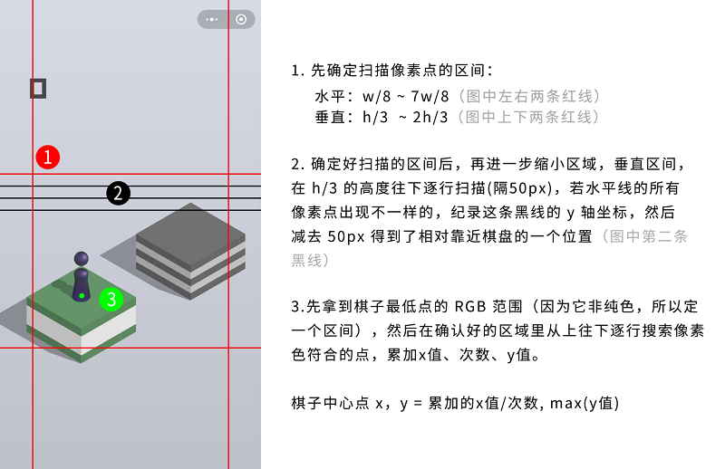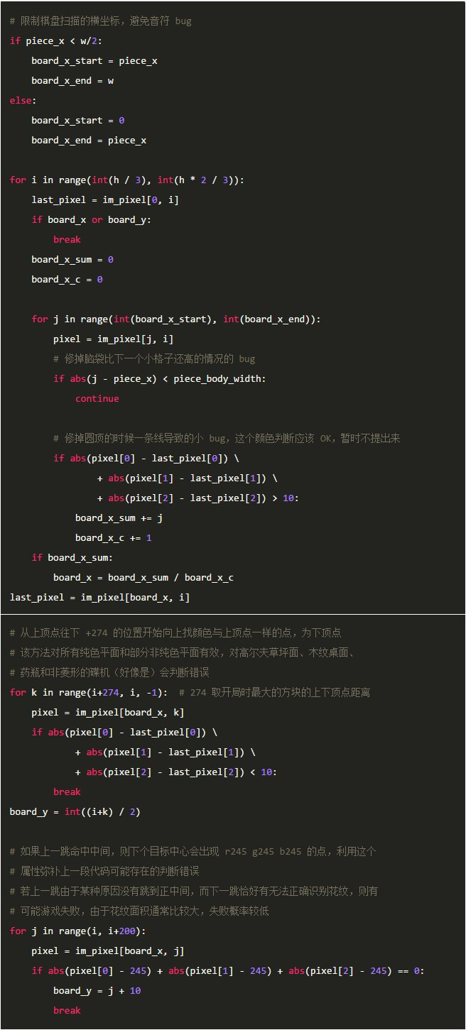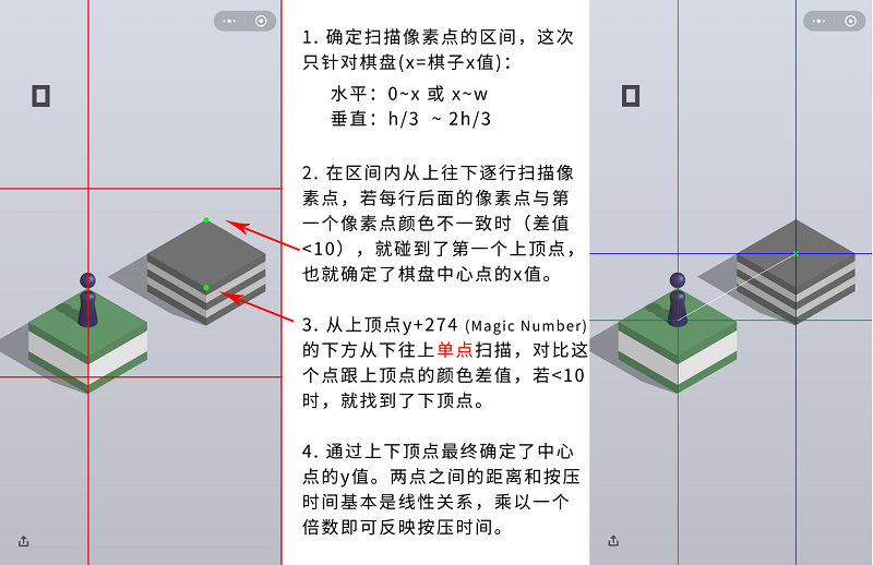 总结一下,目前这个方案基本没有太大问题,但如果跳一跳游戏把背景改成了非线性渐变,或随机飘落一些物体,或棋盘表面更加复杂,那这里的算法就基本不可用了。