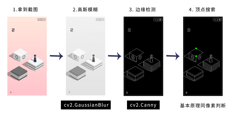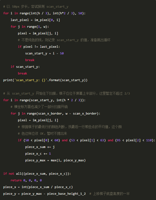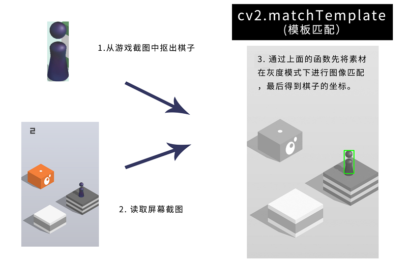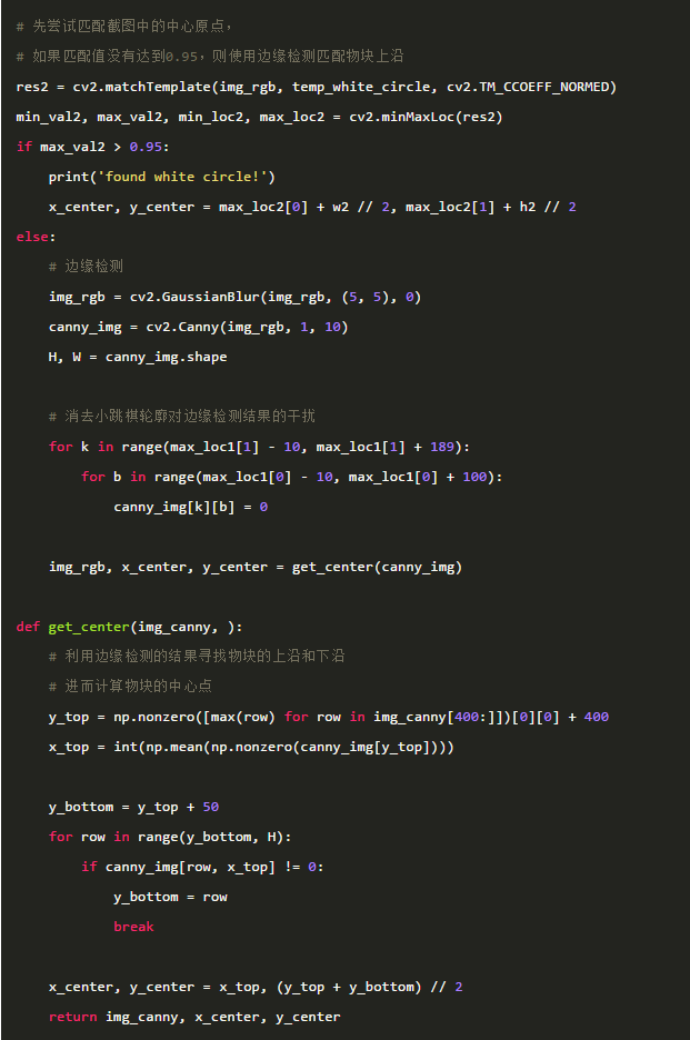 基于像素点的判断低效而且不够健壮,而利用 OpenCV 计算机视觉库则可以从图像分析层面进一步简化判断逻辑提升效率,首先采用该方法的跳一跳小游戏「辅助程序」来自 wechat_jump_jump。它是这么得到棋子的位置的: