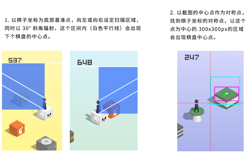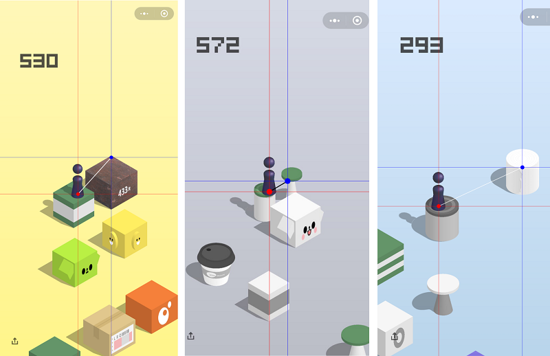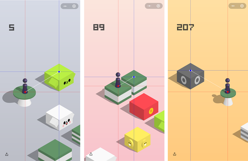还有一点值得一提,按压时间这部分还是有优化的空间,前面提到了跳跃距离和按压时间基本是线性关系,但越到后面可以越发现,距离并非和按压时间绝对成线性比例,因为游戏本身不是一个纯 2D 的平面场景(2.5D),所以我们测量到的直线距离在 2.5D 场景中是有变化的,虽然影响不大,但在游戏后期棋盘越来越小,距离越来越大时,容易凸现出问题来,所以关于距离的计算有几种不同的解决: