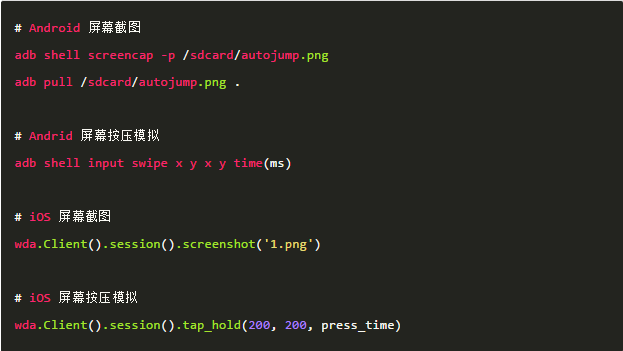 这两个分别是针对 Android 和 iOS 的命令行工具,可以将手机和电脑连接起来,并通过命令行发送指令,指令中就包含了屏幕的截图和按压模拟。不过 iOS 配置起来稍微麻烦一点,具体操作指引可以参考 这里。其核心的命令有: