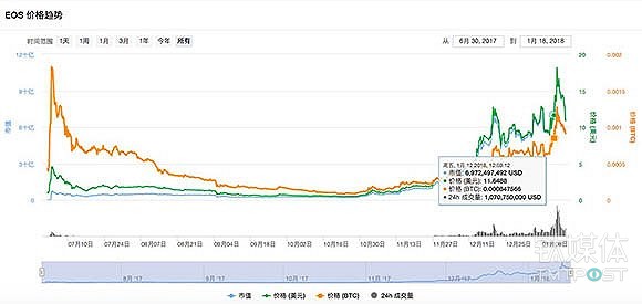 他的美梦仅仅持续了几天。1月13日,EOS达到历史高点18.16美元,随后直线下跌,1月17日界面记者采访时,已跌破10美元。