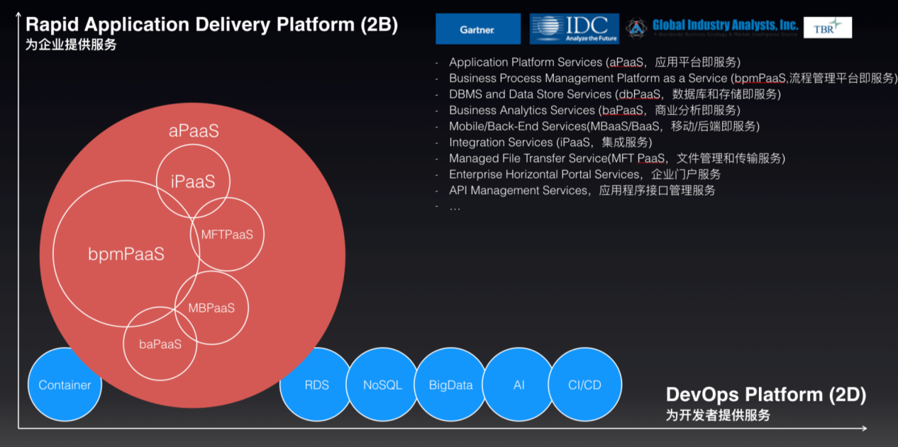 刘金柱认为,SaaS应用场景非常多样性,如HR、CRM、财务、OA等等。但是从SaaS开始,到PaaS、IaaS,越往下,越抽象、越基础,最终还原成二进制世界的0和1。相对于SaaS,PaaS就是把构建上层应用场景的能力抽象化、产品化和产业化,降低重复造轮子的风险和成本。其中,抽象化主要回答解决什么问题;产品化主要是满足对应用稳定性、可靠性、性能等产品方面的需求;而产业化主要是产品可以供第三方使用,形成第三方使用的闭环小生态。我们可以从为开发者提供服务和为企业提供服务两个维度——面对开发者和面对企业——来认识PaaS,来对PaaS分类。开发者关注什么问题?2D的PaaS面向应用开发者,即DevOps,帮助开发者快速、敏捷地提交应用,从开发到维护。所以,抽象的能力应该包括:编程驱动的交付能力,容器服务、数据、缓存、框架、语言、测试、部署等等,以及最近流行的FaaS函数服务。企业关注什么问题?企业用户关注的是应用场景的流程设计、系统集成、移动体验、BI分析、版本的升降级等。2B的PaaS 提供的能力包括:低代码开发,零编程或者不编程,提供BPM、集成、IM、BI、Mobile等企业IT能力。完整PaaS必须拥有两个核心要素:一是对应用生命周期的管理,二是构建各类应用场景的能力。2D的PaaS一般由Kubernetes、Cloud Foundry等负责应用周期管理,关注编程交付的流水线。2B的PaaS因为商业化价值的不同,就形成了不同的平台,如炎黄盈动提供的业务流程管理的BPM PaaS,七牛的云存储PaaS,Salesforce CRM PaaS,甚至IM PaaS等,关注的是低代码业务驱动的交付流水线。