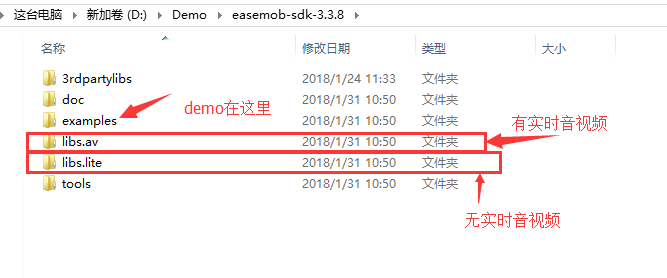libs.lite 文件夹:无实时语音、实时视频功能的 SDK 包,如果项目中只用到聊天功能,可以把项目里的 jar 和 so 文件替换成此文件夹里的文件 文档参考