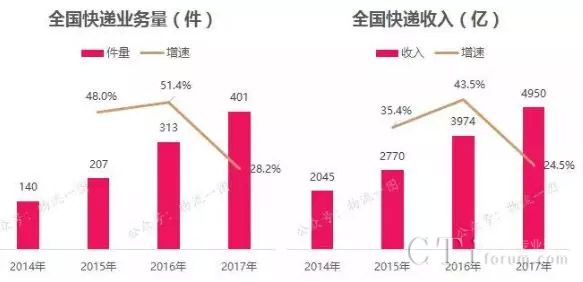 据国家邮政局最新数据显示:“2017年,全国快递服务企业业务量累计完成400.6亿件,同比增长28%;业务收入累计完成4957.1亿元,同比增长24.7%。未来几年仍将保持超过20%的速度增长,预计到2020年包裹数或突破700亿件,市场空间仍然巨大。”