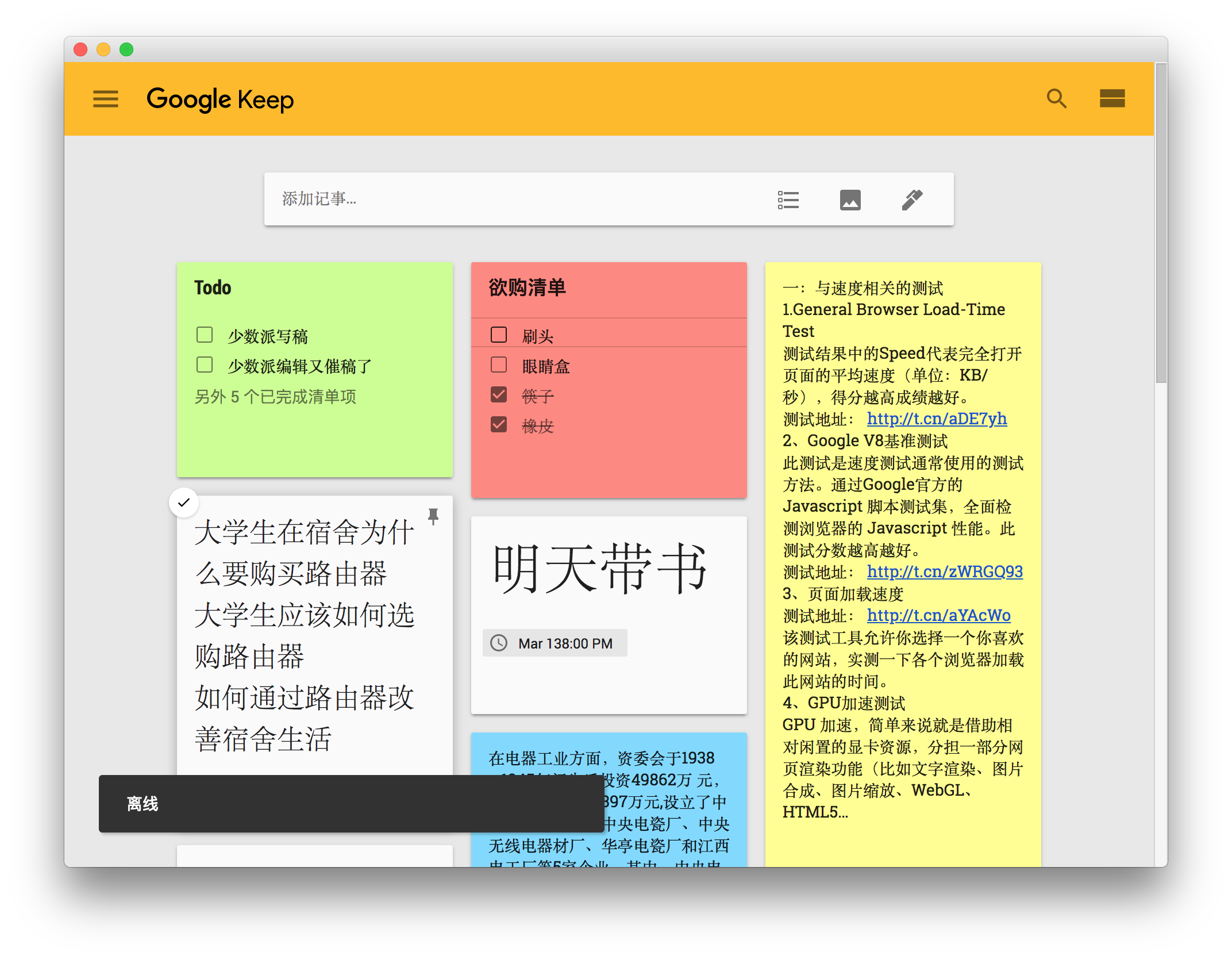 ⏰叮叮叮……闹钟在七点钟准时响了起来,我不得不铺好被子下床关掉闹钟,刚一关掉,手机上的通知栏就来了一条备忘提醒。原来是昨晚我在 Mac 上用「Google Keep」记下的今天要给同学带的书。Keep 没有原生 Mac 应用,但是 Chrome 商店里有一款可以离线使用的 Keep 应用,能在 Launchpad 生成独立的应用图标,使用起来非常方便。
