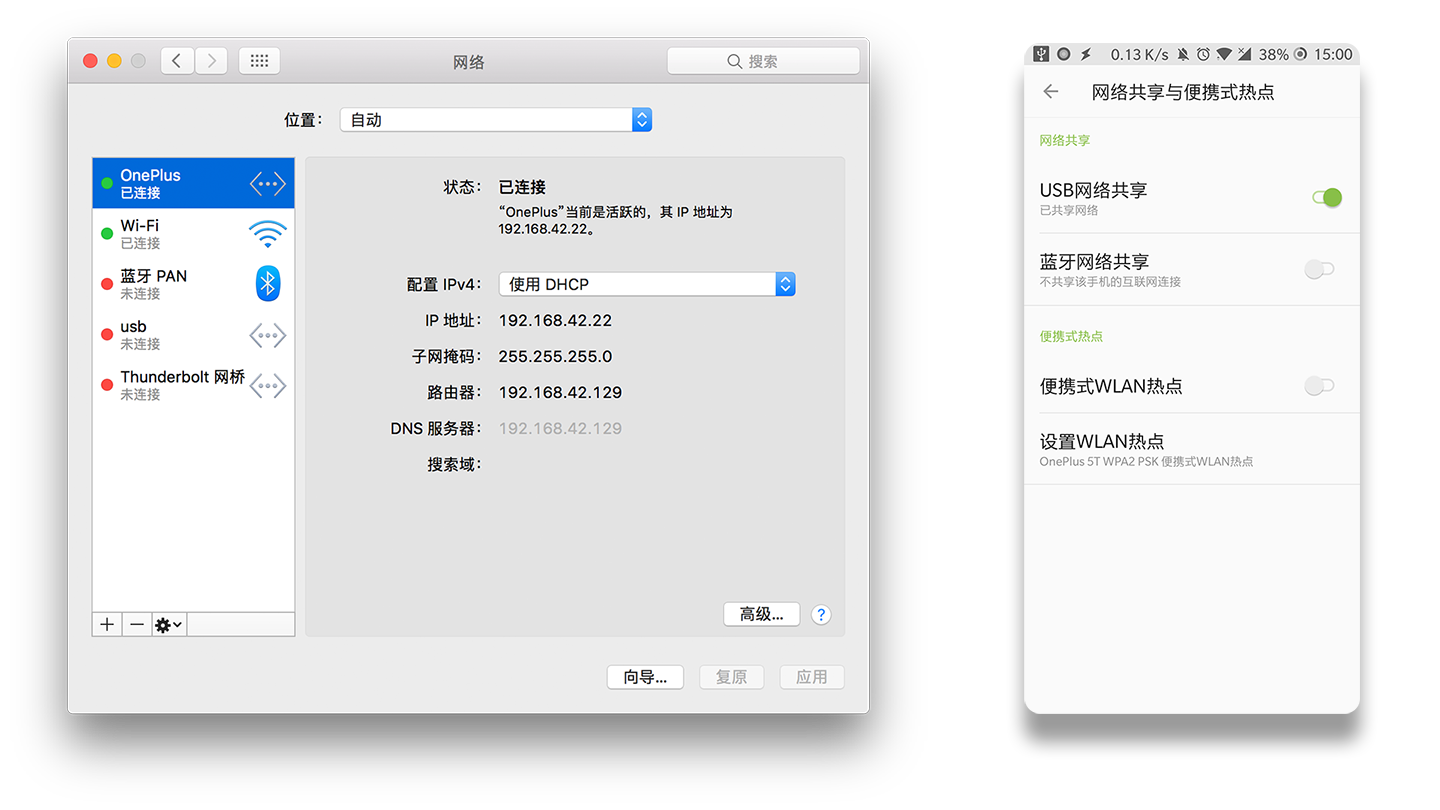坐在图书馆,里面的无线网络却非常不稳定,无奈我只能把手机当成网络接入点。直接开热点电池损耗大,没多久电量就见红,所以我安装了一款开源的软件 HoRndis,这样使用数据线连接 MacBook,打开设置中的网络共享,勾选 USB 网络共享即可。这样既可以给手机充电,又能给电脑高速上网。