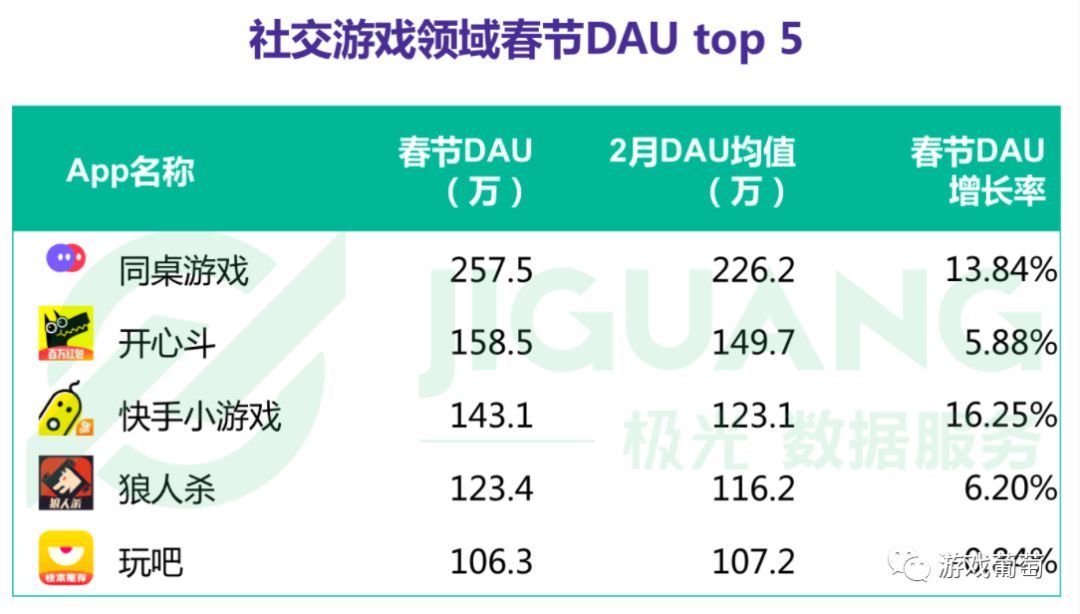 较早的“爆料”来自极光大数据。在《春节期间热点app数据观察》这篇报告中,人们发现:“社交游戏”分类下,除了《狼人杀》这一单款头部产品,Top 5完全被几个小游戏对战平台占据。