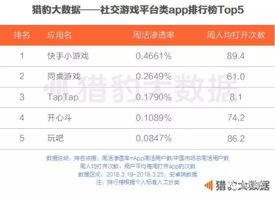 猎豹大数据3月份公布的排行榜则显示,依托快手app,快手小游戏的数据迅速增长,成为3月同类app中平均打开次数、渗透率最高的。