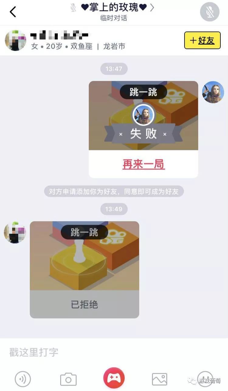 每局对战结束,系统会自动跳转到聊天界面,接下来由用户去决定干什么。从葡萄君匹配到的用户来看,很多人一局结束后还是会继续玩游戏,而不是把时间放在聊天上。少数几次遇到对方主动说话的场景,是在对战结束后,对方几乎在1秒内飞快地发来“我6不6”或是“还玩吗,要不要换一个游戏?”之类看起来有点套路化的内容。葡萄君试着在游戏结束后和一些对手主动对话,也均未得到回应。没有真实的语言互动,这些对手看起来就像机器人一样。