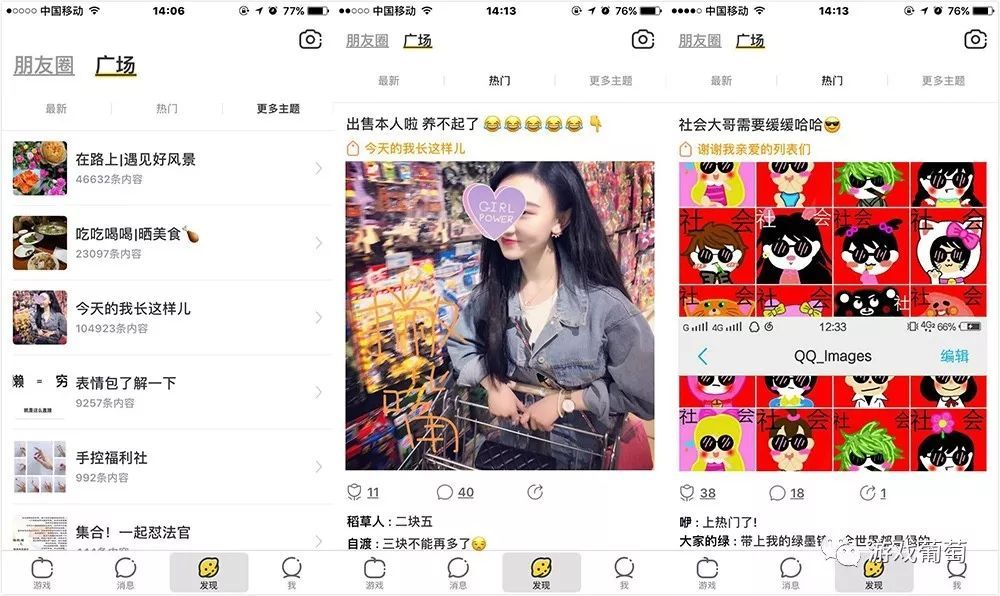 玩吧则采用了“广场”+“朋友圈”,朋友圈里是现存好友的动态。广场的形态则更近似微博,给用户提供一个UGC的场所,平台也会依据算法做推荐。在这个分区中有了一些典型社交的感觉,官方推荐的热门多是年轻女孩、搞笑图片一类的内容。
