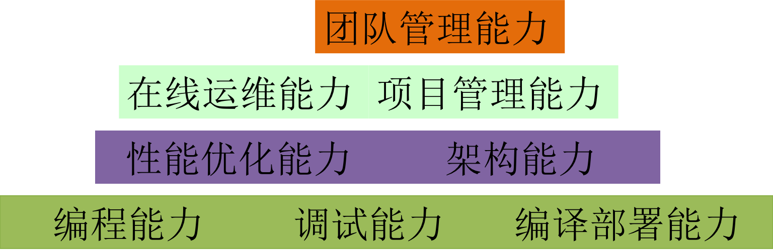 这几种能力之间的关系大概如下图。编程能力、调试能力和编译部署能力属于最基础的能力。不能精通掌握这三种能力,很难在性能优化能力和业务架构能力方面有所成就。具备了一定的性能优化能力和业务架构能力之后,才能在线运维能力和项目管理能力方面表现优越。团队管理能力是最高能力,它对项目管理能力的依赖度更大。