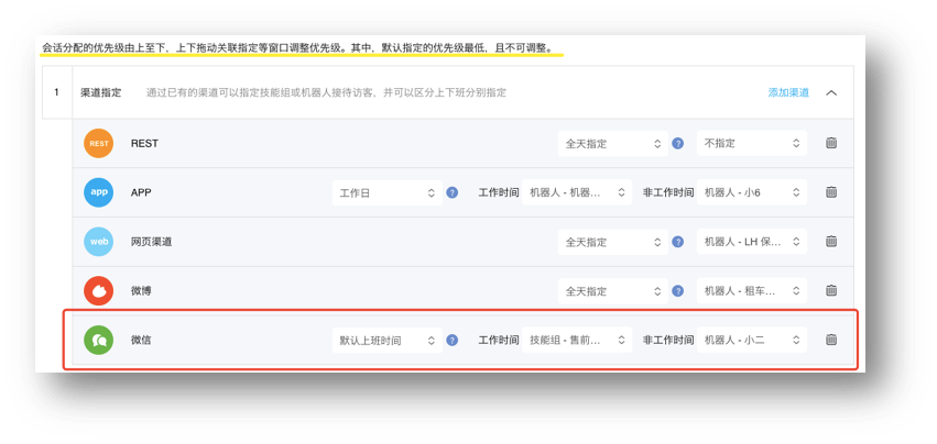 1. 渠道指定:为APP、网页、微信、微博四种渠道分别指定机器人或技能组。以上4种渠道来的客户会话,可以设置渠道指定规则来指定技能组接待。举个栗子:我们想让微信渠道来的客户咨询都由我们创建的“微信服务组”这个技能组来接待,那么我们就可以在“管理员模式 >设置 > 会话分配规则 > 路由规则 > 渠道指定”中添加一个规则,选择微信渠道指定接待的技能组(可区分上班时间和非上班时间,且需要将“渠道指定”栏拖拽到最上方,因为最上方的设置优先级最高)。这样,微信渠道的客户咨询就会全部分配到我们指定的技能组了。
