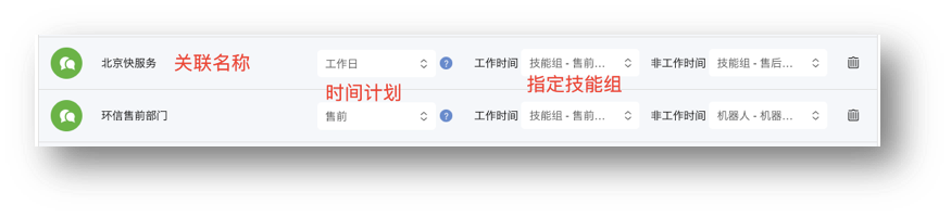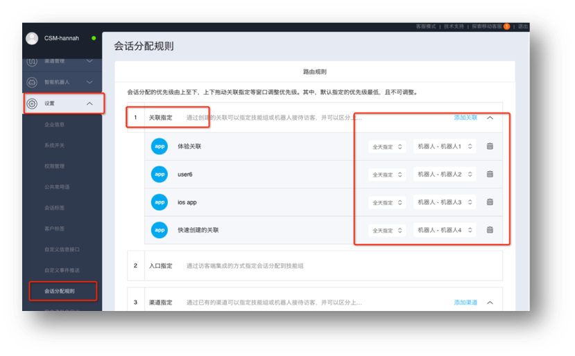 2. 关联指定:有几个咨询入口就建立几个关联,每个关联对应不同的机器人: