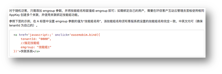 3. 入口指定:集成APP和web渠道时,均可以将“联系客服”按钮指定不同的技能组。在客户互动云中,集成时将按钮指定技能组的方式统称为“入口指定”。又举个栗子:比如我们在网站首页设立的咨询入口进入的咨询,分配给“售后咨询”技能组来接待,在产品详情页设立的咨询入口进入的咨询,分配给“售前咨询”技能组来接待。可以在 web渠道集成时来实现,具体集成方法请见环信帮助文档: