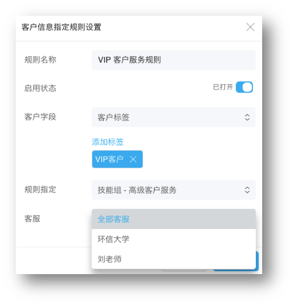 规则设置过程为首先设置名称,确保是打开状态才能保证规则生效,根据我们的需求是 VIP身份的客户指定给高级客户服务技能组,点击添加标签选择 VIP 客户标签(可同时选择多个),然后选择接待的技能组“高级客户服务”即可(在这里可以选择机器人)。补充说明:我们即可以指定技能组也可以选择指定给某一个客服坐席,即图片下方的选择客服。