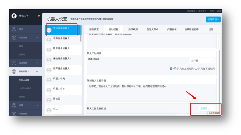 5. 机器人转人工指定技能组:在机器人与客户的对话中会有一部分解决不了的问题需要转接给客服坐席,环信客户互动云支持在转人工坐席时指定技能组,让机器人解决不了的问题由指定的技能组来接待。再举个栗子:我们想让“活动咨询机器人”在转人工时指定【活动咨询服务】技能组来接待:可以在活动咨询机器人的自动回复à自动回复à转人工设置à转人工指定技能组中进行选择: