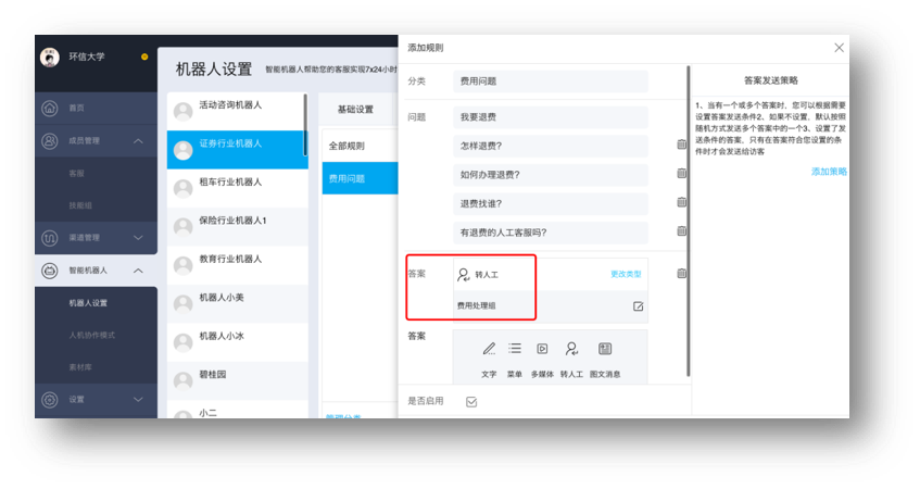 6. 知识规则转人工指定技能组: 环信客户互动云的智能机器人知识规则(问答对)支持将答案直接设置为转人工操作,当客户问题匹配到规则中的问题时,系统会直接将会话转接给人工坐席,在这里可以设置回答该问题的技能组。又举个栗子:机器人知识规则中设置一个问题,问法如下:1. 我要退费 2. 怎样退费 3. 如何办理退费。。。。。。,设置答案选择转人工,在设置时可以选择指定技能组“费用处理组”。