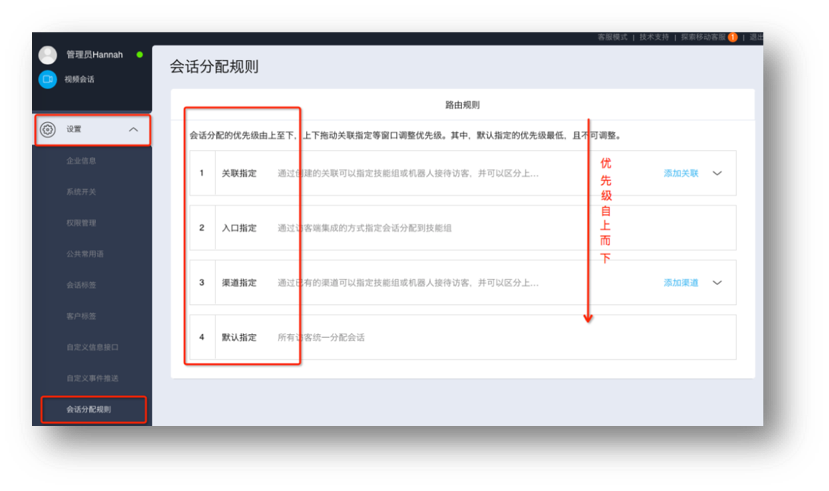 1. 设置路由规则优先级顺序为:关联指定、入口指定、渠道指定、默认指定(注意:顺序),如下图: