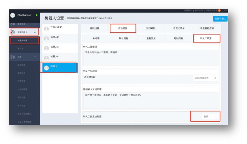 这个设置比较适合使用多机器人的企业,每个机器人对应不同的技能组,专业问题让专业坐席来接待。