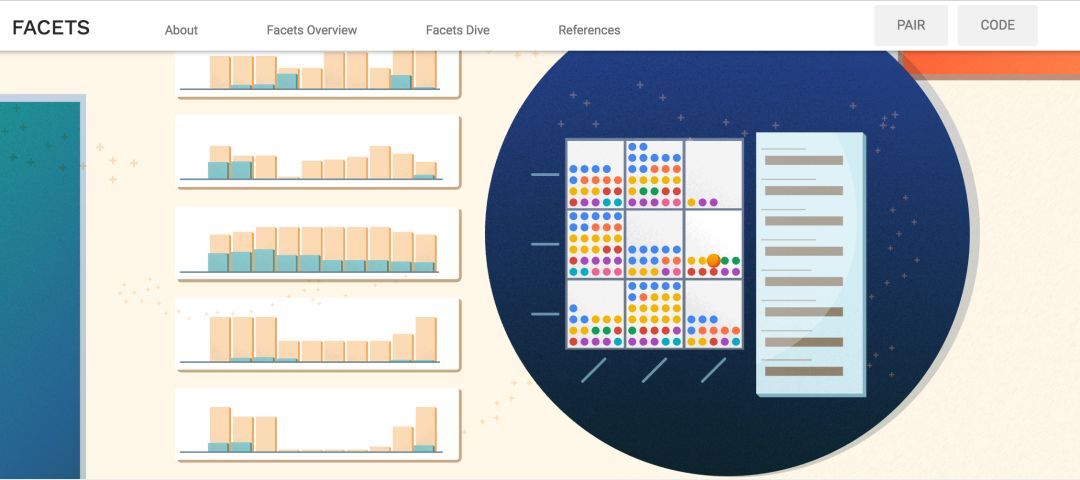 Facets 包含两个部分 —— Facets Overview 和 Facets Dive ,允许用户以不同的粒度查看其数据的整体图像。Facets Overview 可用于可视化数据的每一个特征,Facets Dive 用来探索个别的数据观察集。