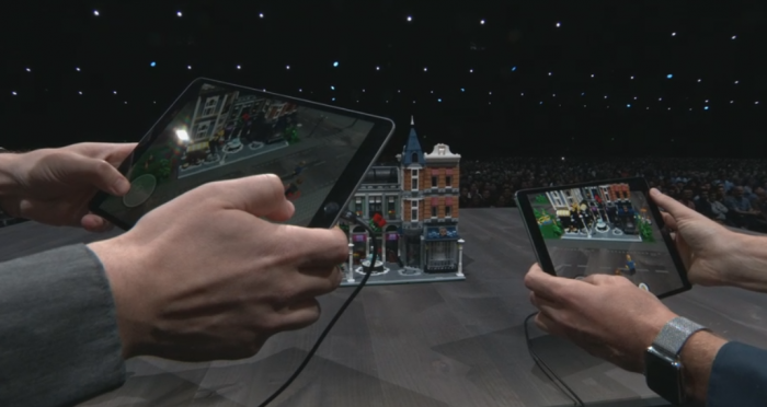 2、 AR增加多用户支持,可以多人共享一个 AR 环境,譬如两个人一起玩同一个 AR 游戏。苹果还与乐高进行合作开发游戏,用户可以在桌面上的一个乐高建筑模型上体验一个直接生成的 AR 游戏舞台,并且可以两个人一起玩,这款游戏将在今年晚些时候上线。