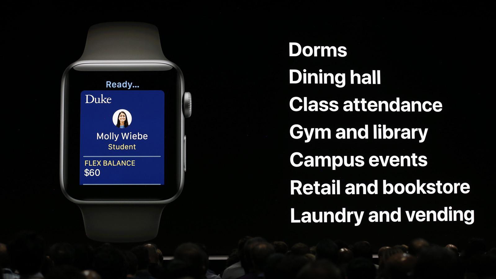(6)学生在可以添加到手机和Apple Watch上的电子钱包。将手表放在读卡器附近,如宿舍或图书馆。支付校园小吃,洗衣等等。