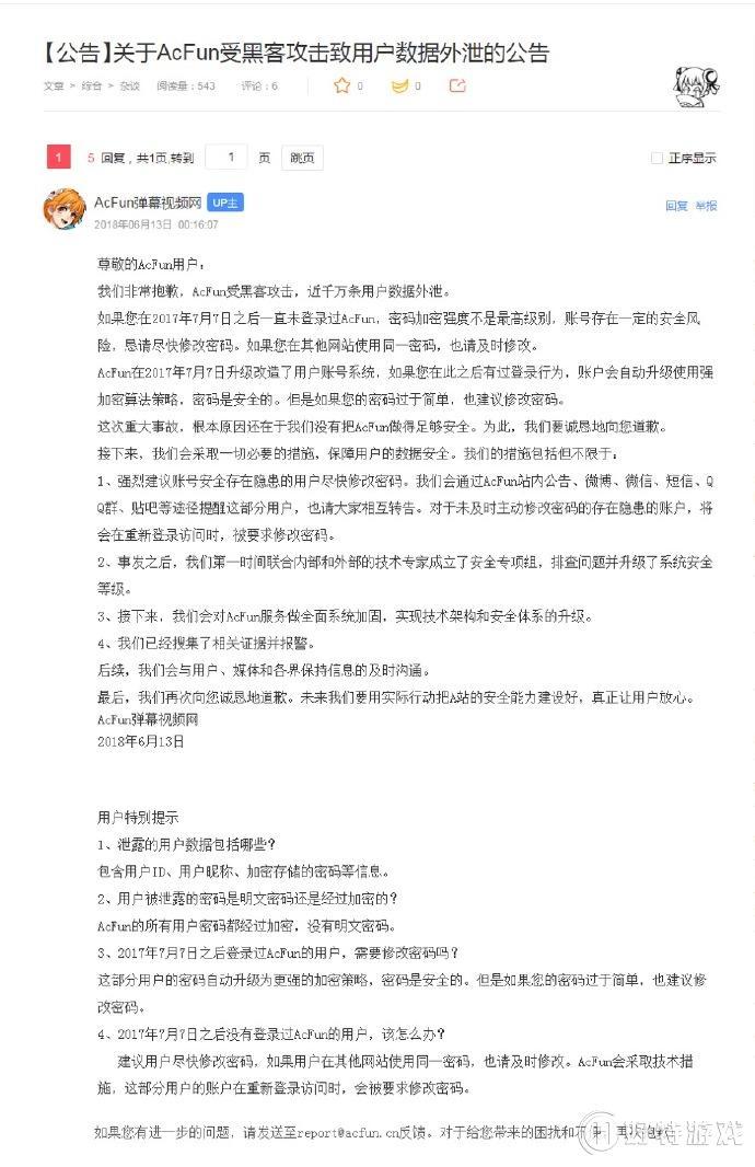 下面是关于AcFun受黑客攻击致用户数据外泄的公告全文:
