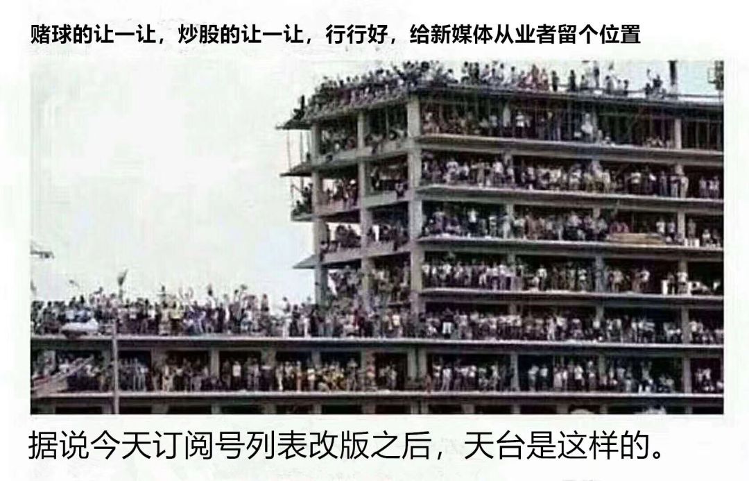 这次微信订阅号史上最疯狂的改版,真的让我措手不及。当我打开朋友圈,我发现新媒体从业者的声音已经淹没了赌球者的声音,他们高呼“天台见!”
