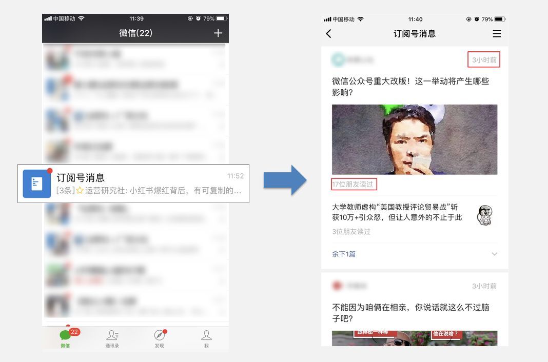 用户打开订阅号消息列表后,只能看到订阅号名称、文章标题、封面图、多少位朋友读过、多少分钟前发布。