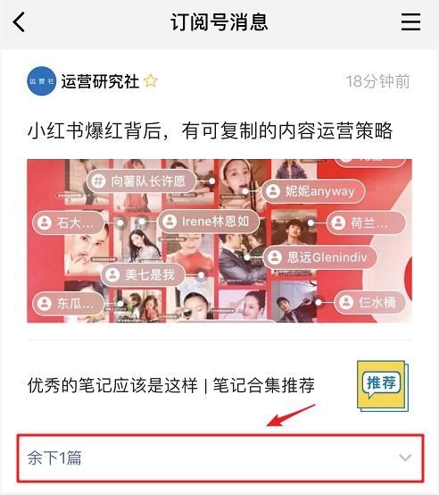 公众号发布的文章只有两篇(头条和次条)能被直接显示出来,其他被自动折叠,需要用户点击右下角的箭头“余下x篇”才能够查看。