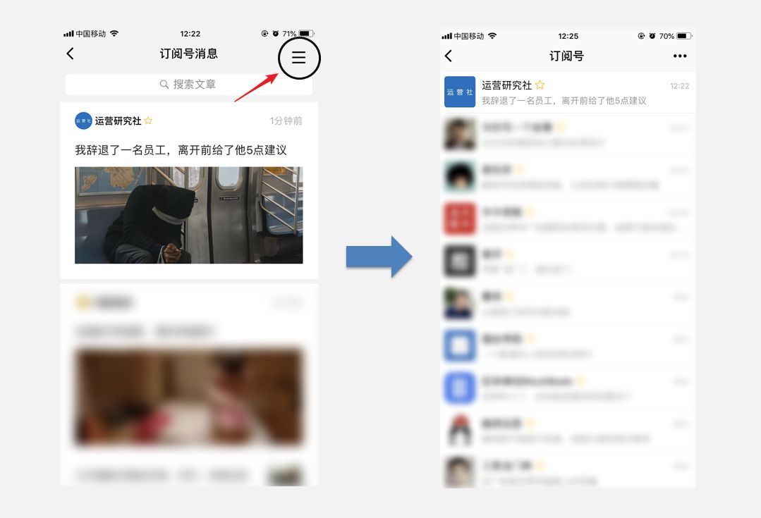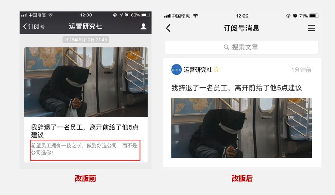 以前进入订阅号列表,页面由”公众号名称+标题”的纯文字形式组成,看文章有 2 步操作,先点击标题,再通过公众号界面的封面图进入文章。