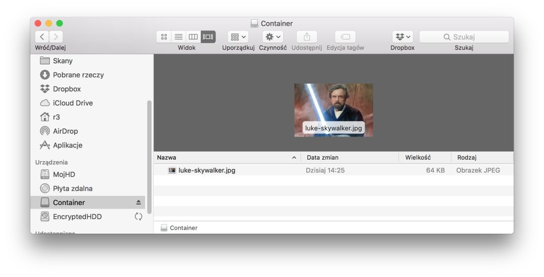 他安装了两个新的加密软件。一个使用 VeraCrypt 软件,保存一个名为 Luke Skywalker 的照片( 本地目录为 /Volumes/Container/luke-skywalker.png),按下空格键使得 Quick Look 生成缩略图。