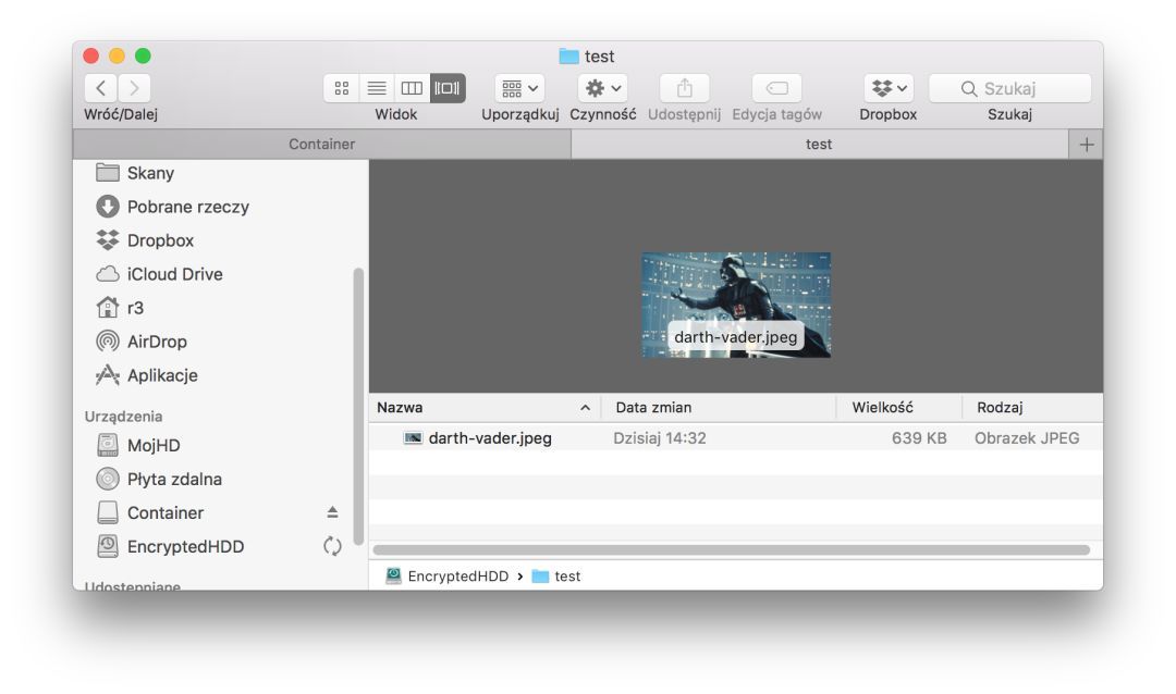 另一个使用 macOS Encrypted HFS + / APFS 驱动器,保存一张名为 Darth Vader 的图片(本地目录为 /Volumes/EncryptedHDD/test/darth-vader.jpeg)。