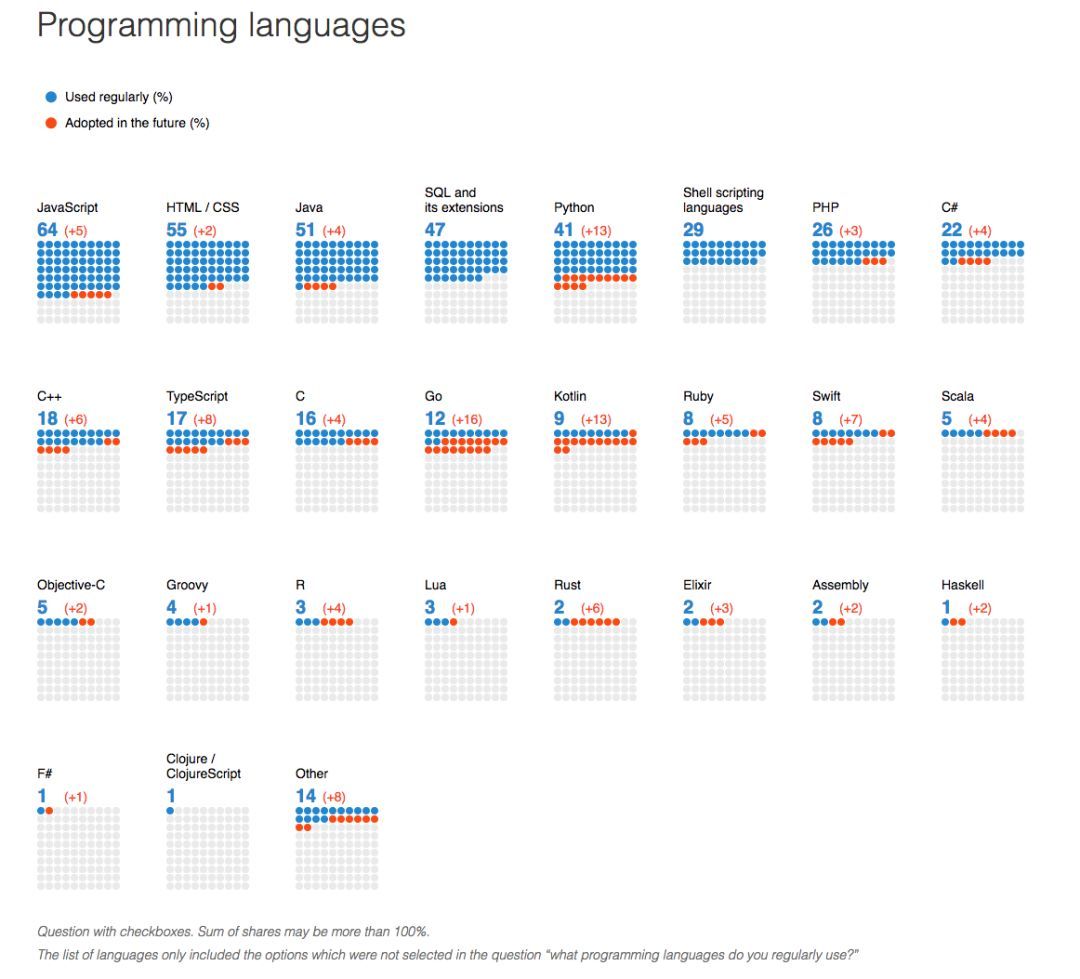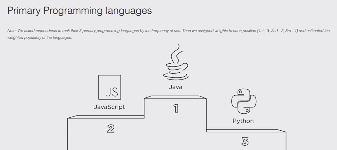 下图中蓝色所代表的是频繁使用,橙色所表示的是即将采用或迁移。从中我们可以看到,Java 是使用最多的语言,占比 64%,其次是 HTML/CSS,而 Java 则屈居第三,果然应了 Jeff Atwood 那句“任何能够用 Java 实现的应用,最终都必将用 Java 实现”。