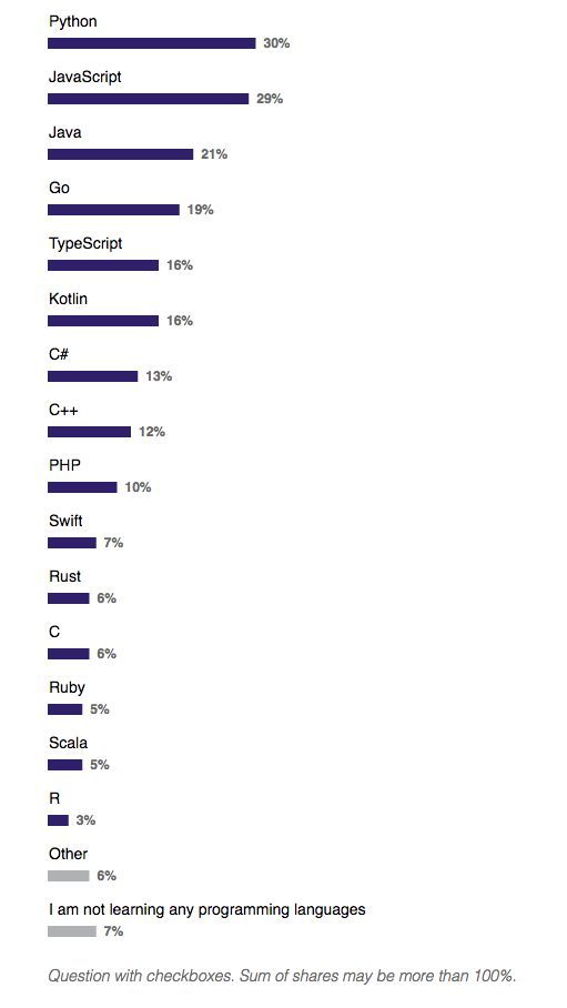 在过去的一年里,有 30% 的开发者正在学习 Python,29% 学习 Java,21% 学习 Java,而 PHP 还是有 10% 的开发者正在学习,但苹果的 Swift 占比则稍微弱些,仅 7%。而不容忽视的一点是,7% 的开发者没有学习任何编程语言,38% 的开发者不考虑采用新的编程语言,这个比例还是很高的。