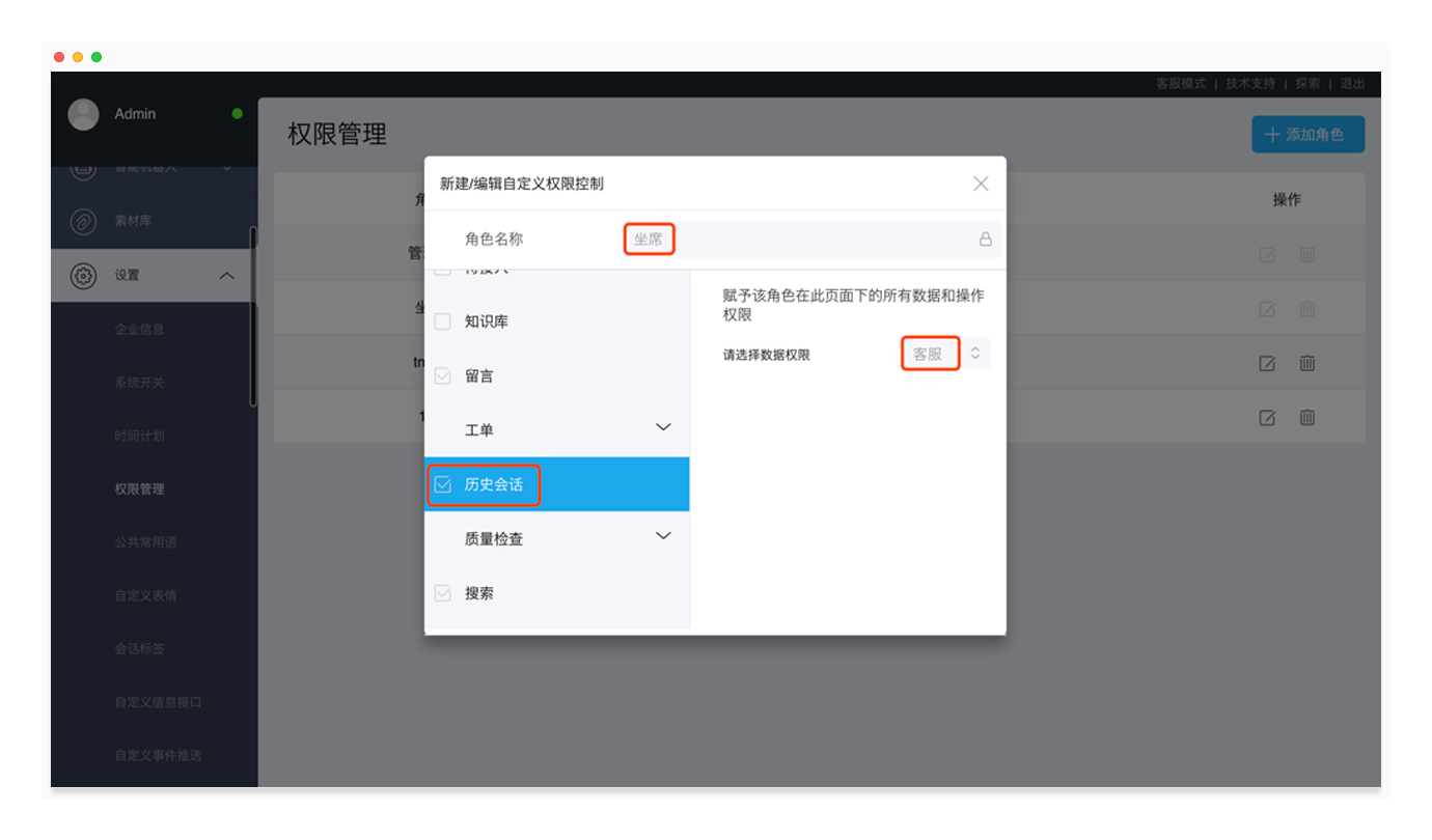 自定义角色权限,客服模式-历史会话增加数据权限。