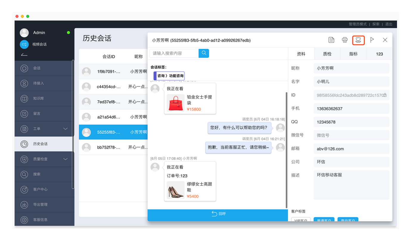 进入“客服模式 > 历史会话”页面,打开历史会话记录详情,可看到聊窗会话标签显示效果优化并可显示所有层级。