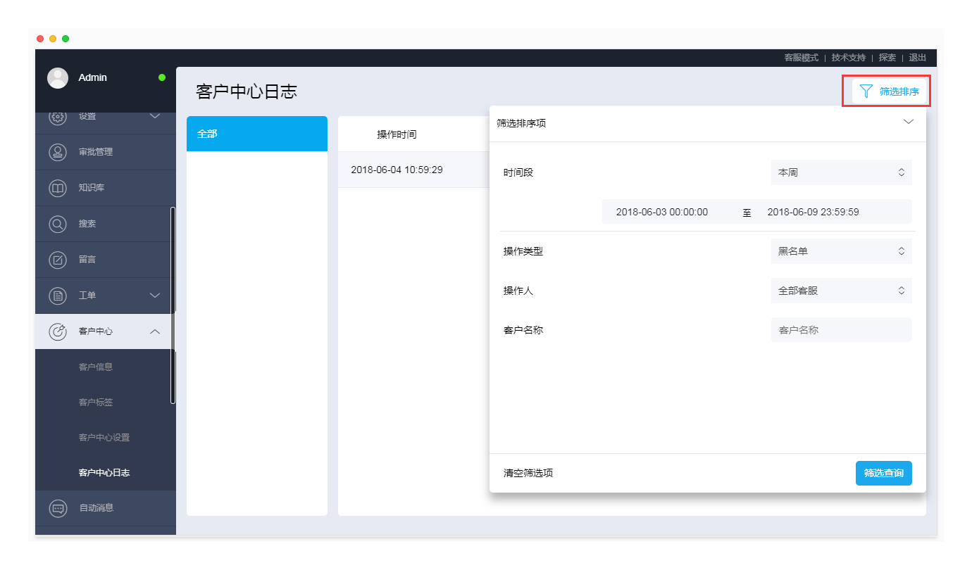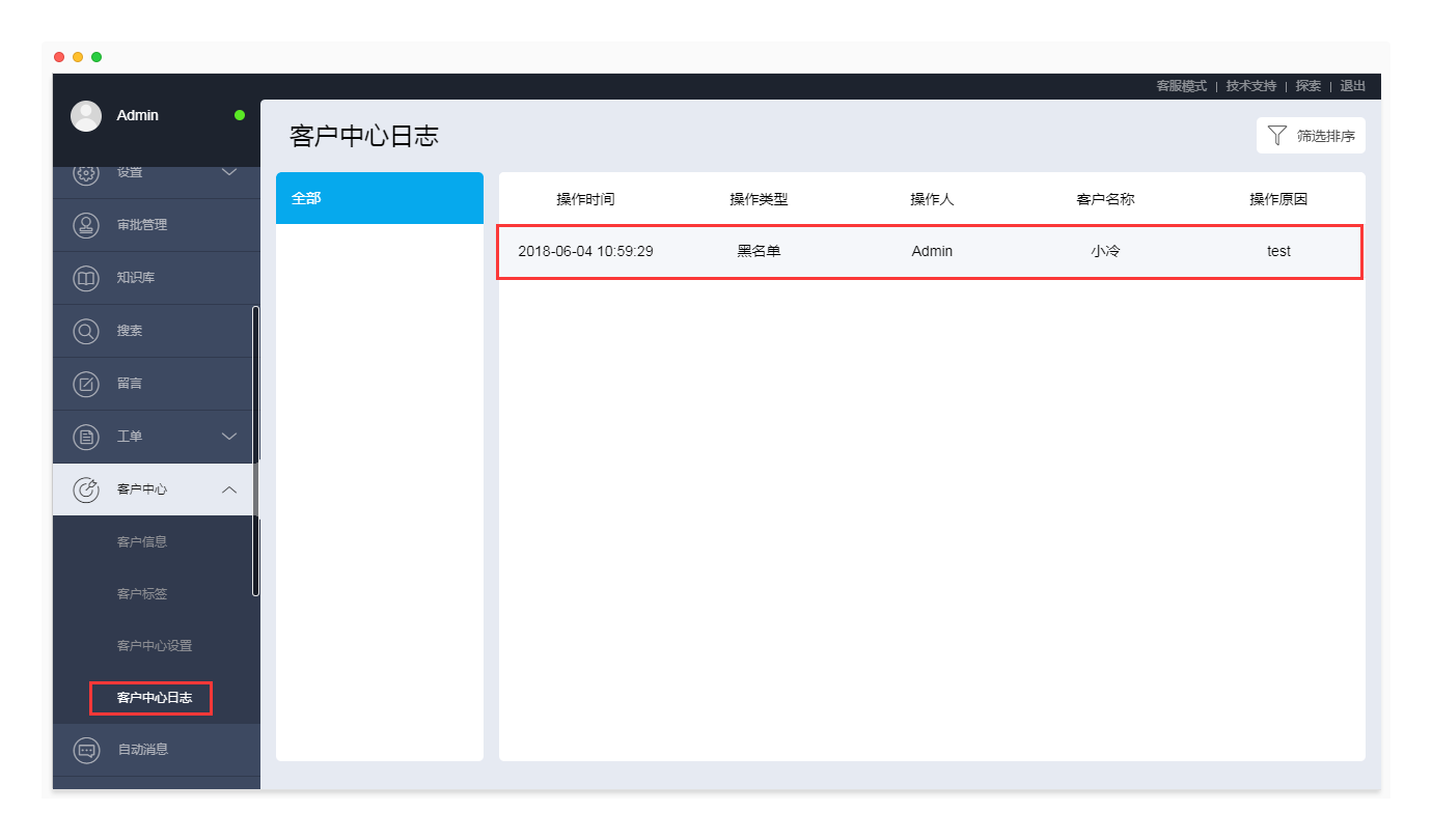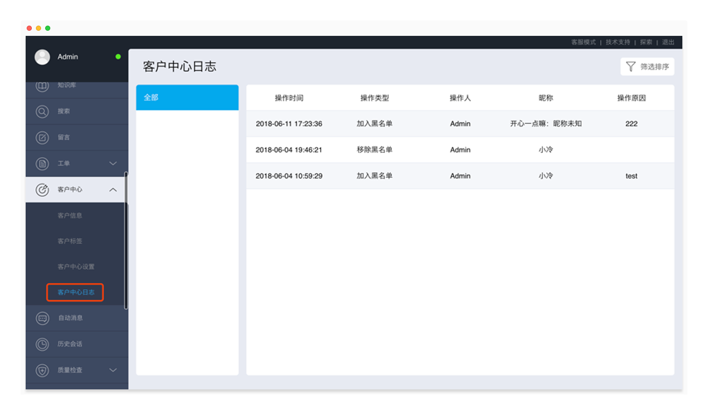 进入“管理员模式 > 客户中心 > 客户中心日志”页面,可以查看到黑名单操作日志,点击【筛选排序】按钮可进行自定义筛选,点击操作日志记录可显示客户资料、互动详情及黑名单操作详情。