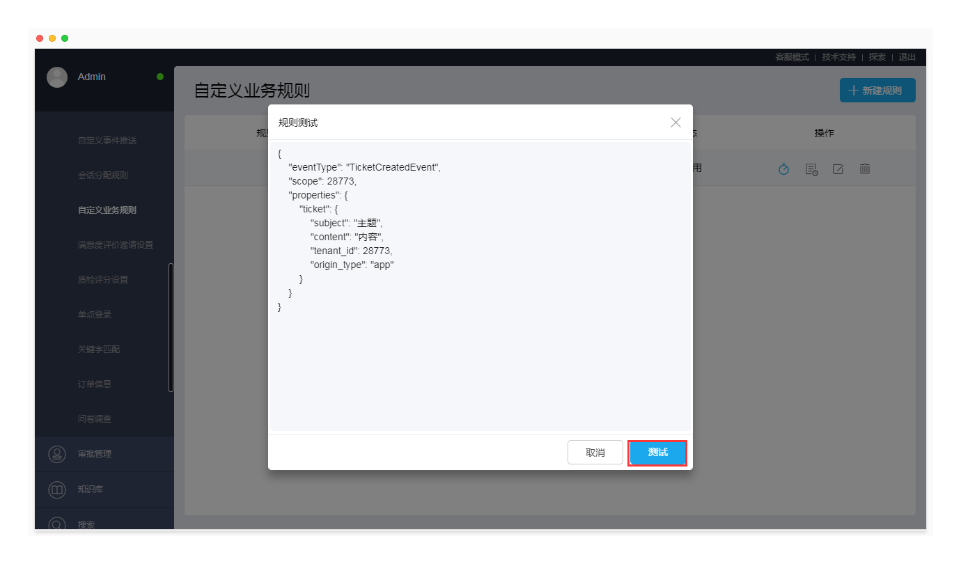 自定义业务规则新增模拟测试功能,可通过测试,判断规则是否可用。