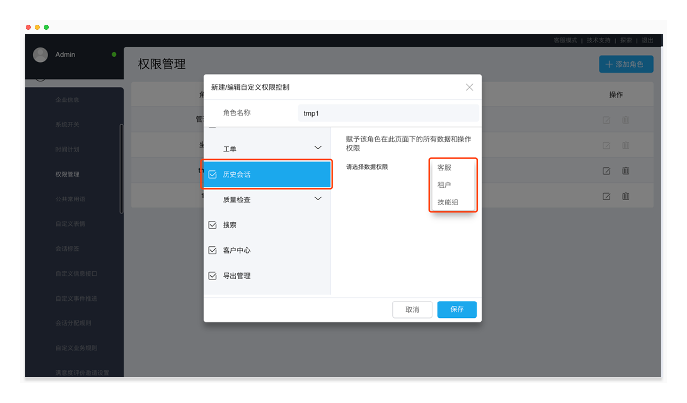 进入“管理员模式 > 设置 > 权限管理”页面,编辑自定义角色权限(或添加自定义角色),找到客服模式下历史会话权限,可查看到右边新增数据权限,下拉列表可选择“客服/技能组/租户”3个选项,可根据需要进行自定义设置。