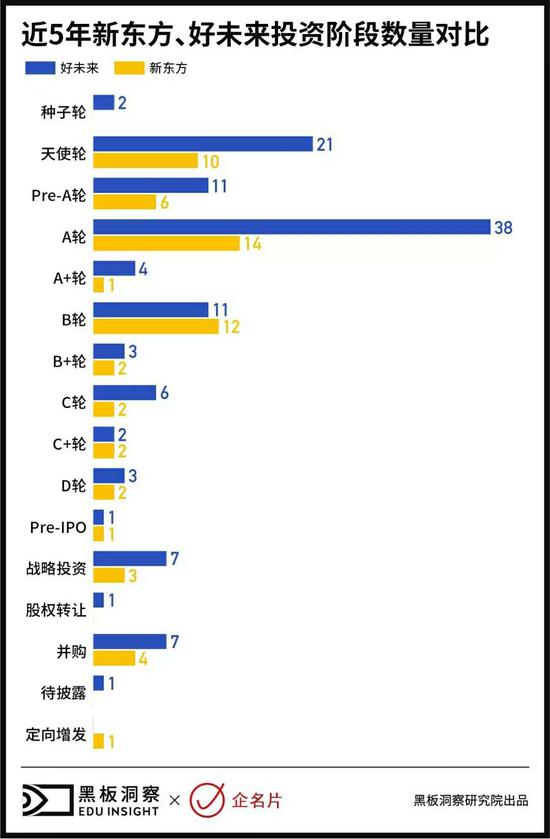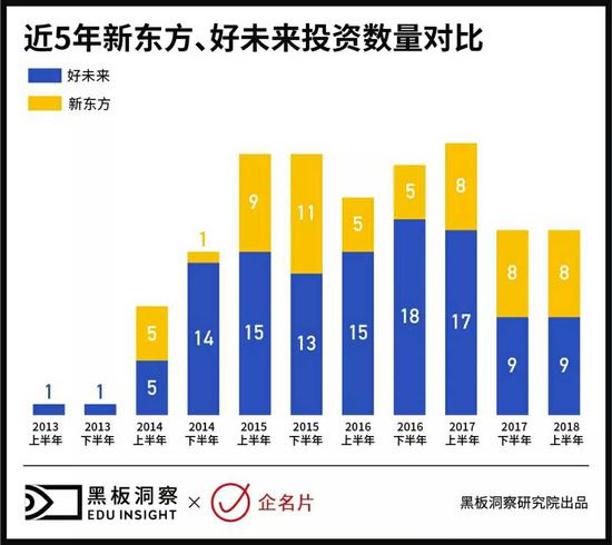14年开始,新东方和好未来在对外投资布局上分别开始发力,黑板洞察通过上图可以看到,双巨头在14年下半年到17年上半年在投资数量上逐渐拉开差距,另外我们还看到17年下半年后,好未来的投资节奏开始明显放缓。