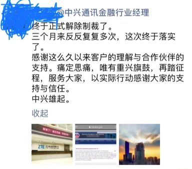 这于中兴上下而言,无疑是近来愁云密布之下最阳光、最开心、最激动的事情。在被解禁后,一位中兴通讯金融行业经理在朋友圈里兴奋地写下了如下的话: