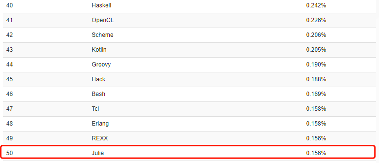 从 2012 年到现在,Julia 1.0 在编程界已经打出了自己的一片“小天地”。截至发稿前,Julia 在 Github 上已经获得了 12293 颗星星,TOIBE8 月份编程语言排行榜上已迅速攀升至第 50 名。
