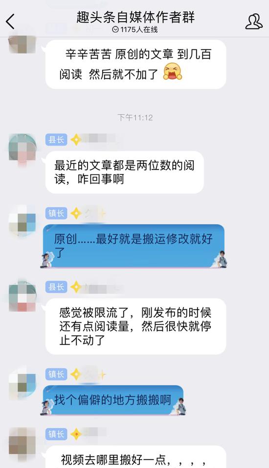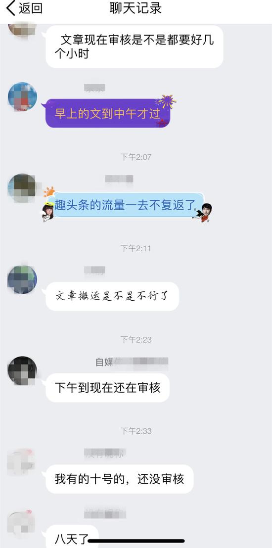 “趣头条的流量一去不复返了”、“文章搬运是不是不行了”、“下午到现在还在审核”、“我有的十号的,还没审核,八天了”,从15号至今(18号),自媒体作者们纷纷在群里抱怨。