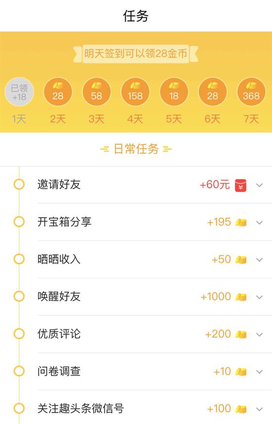 趣头条最早吸引用户,是凭借“登录就领钱,邀请好友就得8元1”的奖励机制。在趣头条上,用户签到、答题、阅读等都有相应的金币奖励,金币最终可以兑换成现金,用这种方式驱动用户阅读。