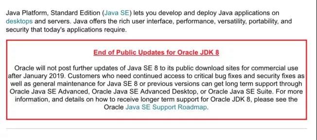 2019 年 1 月之后,Oracle 将不会在其网站上发布 Java SE 8 商业使用的进一步更新下载。如需持续获取安全的 Bug 修复和安全补丁以及 Java SE 8 或以前版本的稳定性支持,可以通过 Oracle Java SE 高级版、Oracle Java SE 高级桌面、或 Oracle Java SE 套件。