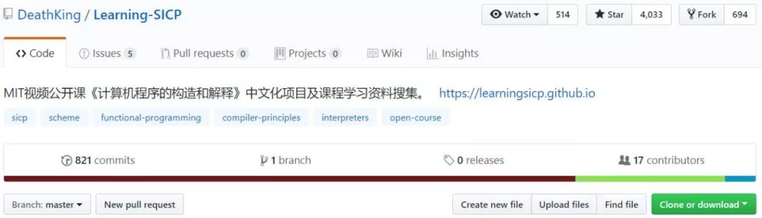 截至今日,该项目已经获得了 4024 个「star」以及 694 个「fork」(GitHub项目地址:https://github.com/DeathKing/Learning-SICP)
