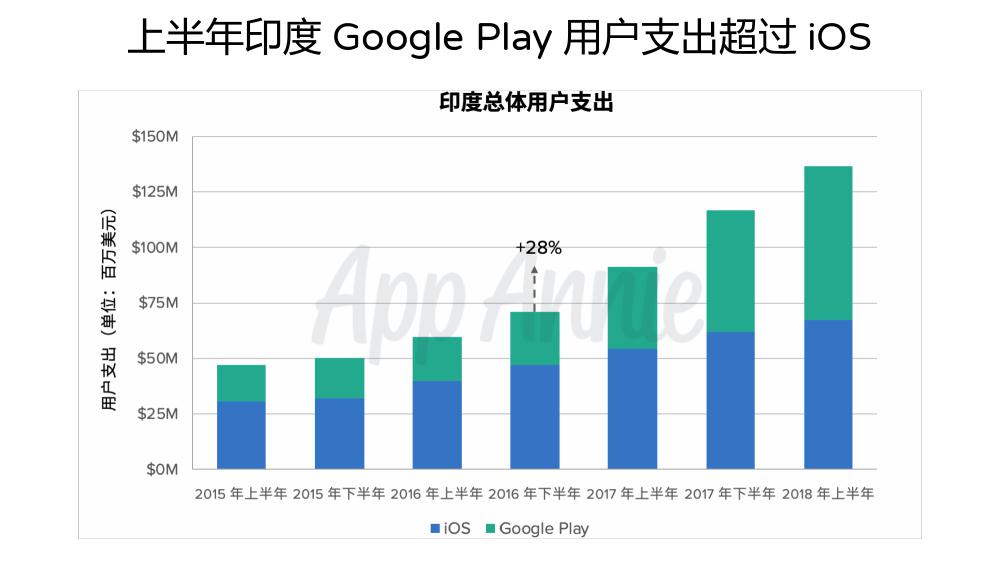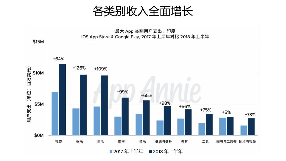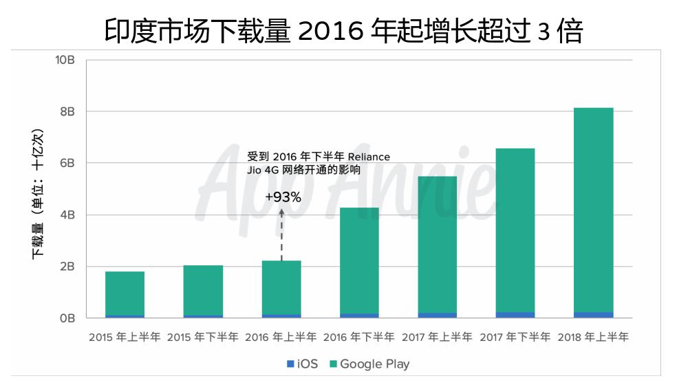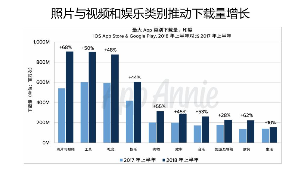 根据 App Annie 2018 年上半年统计数据,印度iOS 和 Android 商店下载量综合已经超过了美国。自2016 年上半年 Reliance Jio 4G 网络的开通,印度下载量增长了三倍,Android 下载量占据了绝对优势。主要应用类别中,照片与视频 App 的下载量增长最为迅速,社交和娱乐也紧随其后。