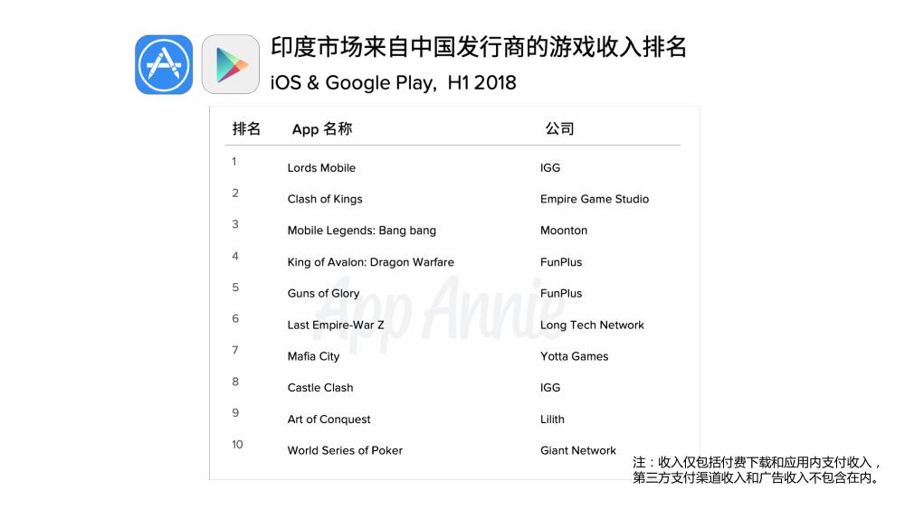 游戏方面,IGG、Elex、FunPlus 位列中国公司在印度游戏公司收入前三,沐童、猎豹移动、游族、龙创悦动、友塔游戏、Tap4Fun和腾讯也进入中国游戏公司收入榜前十。《Lords Mobile》、《Clash of Kings》位列收入榜前列;而 《Bubble Shooter》、《Block Puzzle Jewel》和《Billiards City》占据中国游戏下载量前三。